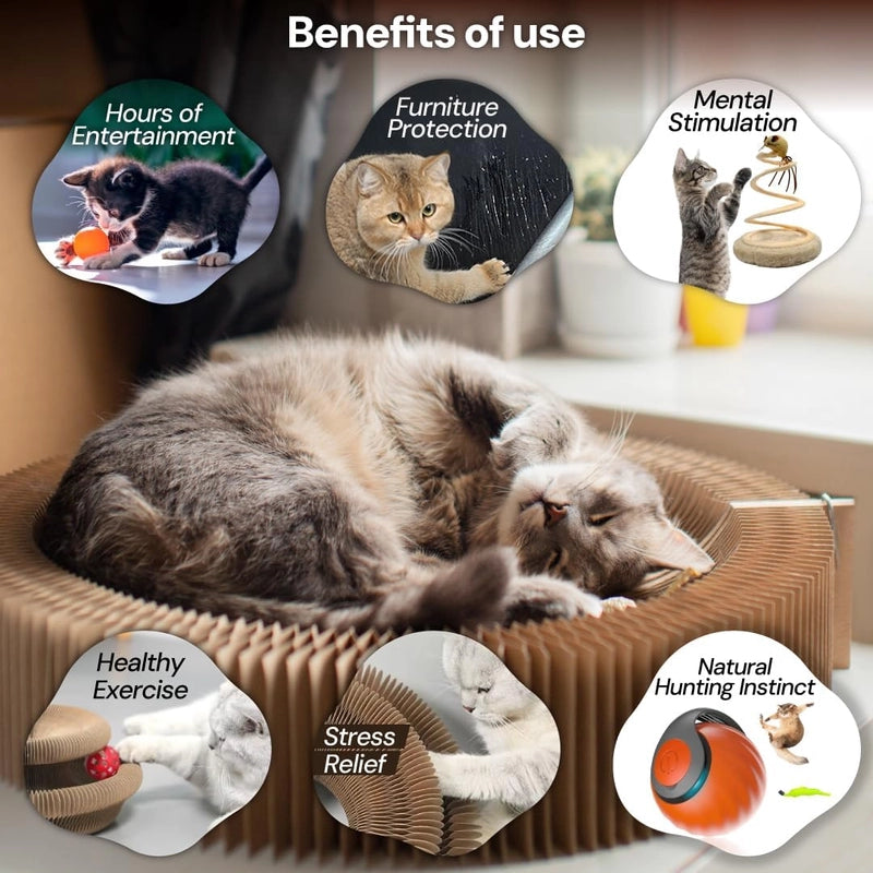 El rascador mágico con la pelota cascabel liberará su energía, afilará sus garras y lo mantendrá activo. ¡No más gatos aletargados!